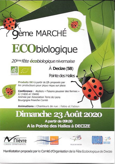 sera à la Fête Eco Bio de DECIZE le 23 Aout 2020. Un stand BIO vous accueillera ( Chantal & Daniel correspondants AKF58)